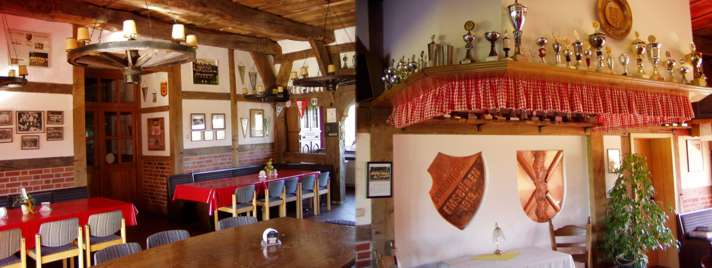 Von der rückseitigen Terrasse aus (Foto oben rechts) hat man ungehindert Einblick auf die beiden Sportplätze, besonders auf Platz 2 (Foto unten links), zumal Gebäude und Terrasse etwas erhöht liegen. Prunkstück im Haus Concordia ist der Gesellschaftsraum (Foto unten rechts). In diesem ehemaligen Wohnbereich des Bauernhauses wurde das alte Eichengebälk original wieder aufgebaut.